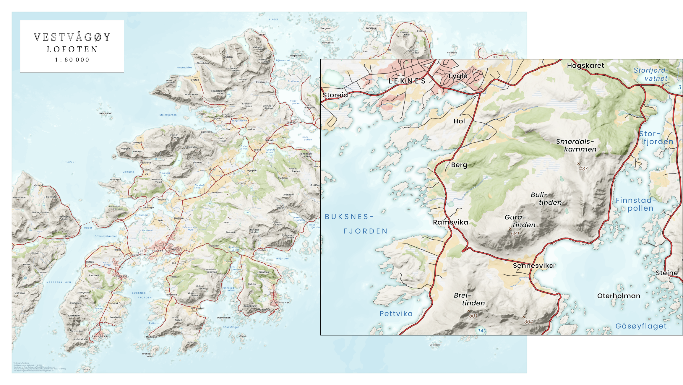 Du bestemmer selv hvilket område kartet skal vise, og alt av farger, detaljer og elementer kan tilpasses: Vil du tone ned blåfargen på havet? Endre veifarger? Legge inn flere stier, navn eller symboler? Alt er mulig!
